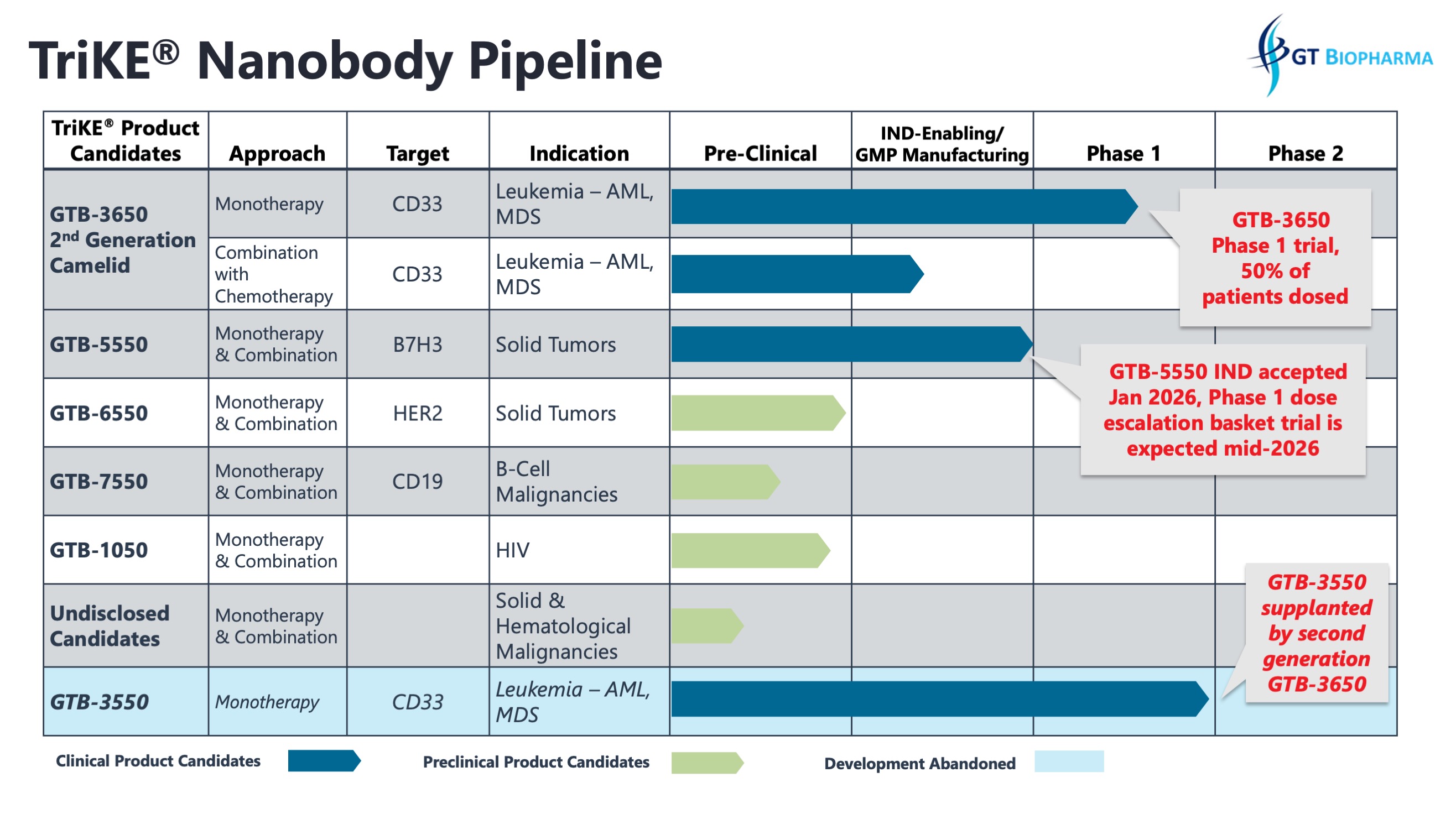 GTB-3650 is the company's first 2nd generation camelid nanobody TriKE® being tested clinically for the treatment of CD33 positive leukemias, including AML and MDS. GTB-3650 TriKE is the first TriKE clinical product that utilizes camelid nanobody technology. GTB-3650 TriKE is a Tri-specific Killer Engager molecule composed of a camelid nanobody that binds the CD16 receptor on NK cells, a single chain variable fragment (scFv) that recognizes CD33 on tumor cells, and human wild type IL-15. The IND application was cleared and enrollment started January 21, 2025. The ongoing Phase 1 dose escalation study is evaluating GTB-3650 for relapsed or refractory (r/r) CD33 expressing hematologic malignancies, including refractory acute myeloid leukemia and high-risk myelodysplastic syndrome. Enrollment in Cohort 4 (10 µg/kg/day) is ongoing, and the Company expects to initiate dosing in Cohort 5 (25 µg/kg/day) in Q2 2026. The Company anticipates providing the next update in the third quarter of 2026, which would include longer term follow-up on the six patients in Cohort 1 through 3 as well as initial observations from patients in Cohort 4 and Cohort 5. Dose escalation may continue up to Cohort 7 as necessary with the potential to evaluate GTB-3650 in a total of 14 patients (two patients per cohort). GTB-3650 is dosed in two-week blocks, two weeks on and two weeks off, for up to four months based on clinical benefit. The trial aims to assess the safety, pharmacokinetics, pharmacodynamics, in vivo expansion of endogenous patient NK cells and clinical activity. More details can be found on clinicaltrials.gov with the identifier: NCT06594445.